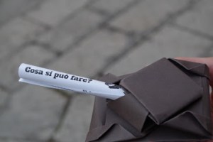«Arrivano i carri armati». Centinaia di carri “armati” di volantini, sono giunti a Como per sostenere la XX marcia per i nuovi desaparecidos della rete Como senza frontiere, che si è svolta sabato 13 gennaio a Como, in via Florio da Bontà. Rumori di spari e esplosioni di ordigni, in sottofondo, scandivano i passi dei marcianti. Attivisti e attiviste di Csf, leggendo cifre carcihe di tristezza e di amarezza, si alternavano ai rumori, altri montavano e distribuivano gli origami.