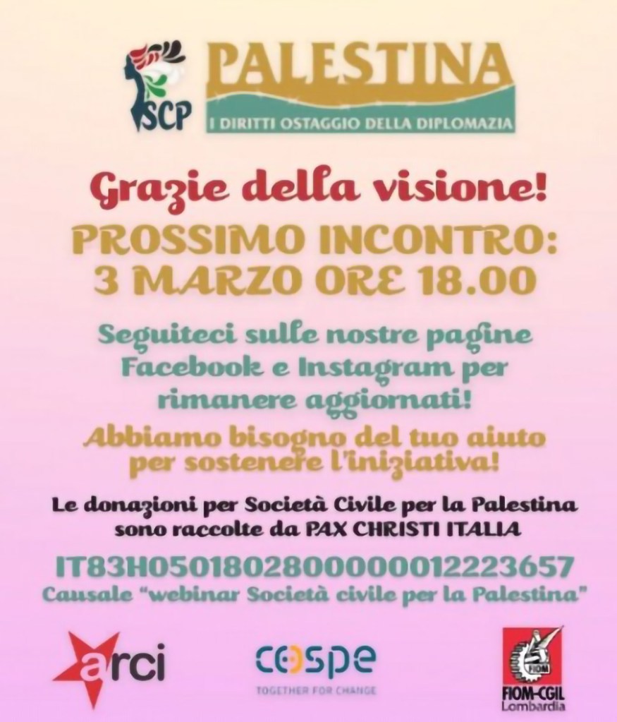 I prossimi incontri organizzati da Società civile per la Palestina si svolgeranno il 3 ed il 15 marzo. [Pietro Caresana, ecoinformazioni]