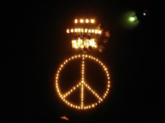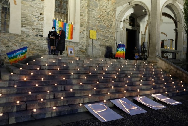 Il percorso si è concluso a Navedano, nel buio quasi totale del dopocena: qui si è allestito con i lumini un grande augurio al Trattato per la proibizione delle armi nucleari, il “buon compleanno T.P.A.N.” sovrastava un grande simbolo pacifista. L’allestimento simbolico, apprezzabile e fotografabile quasi solo dall’alto, è stato inteso anche come viatico per un lavoro comune (non esclusivamente davanti ai riflettori, ma anche dietro le quinte) delle tante realtà che in questi anni si sono impegnate e continuano a impegnarsi per la Pace.