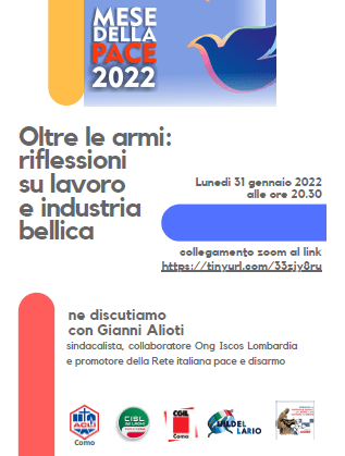 L’incontro Oltre le armi: riflessioni su lavoro e industria bellica, si svolgerà lunedì 31 gennaio 2022 alle ore 20,30 da remoto e sarà possibile seguirlo cliccando sul link https://tinyurl.com/33zjy8ru%5D. L’incontro sarà registrato e potrà essere scaricato in seguito dai canali Youtube.