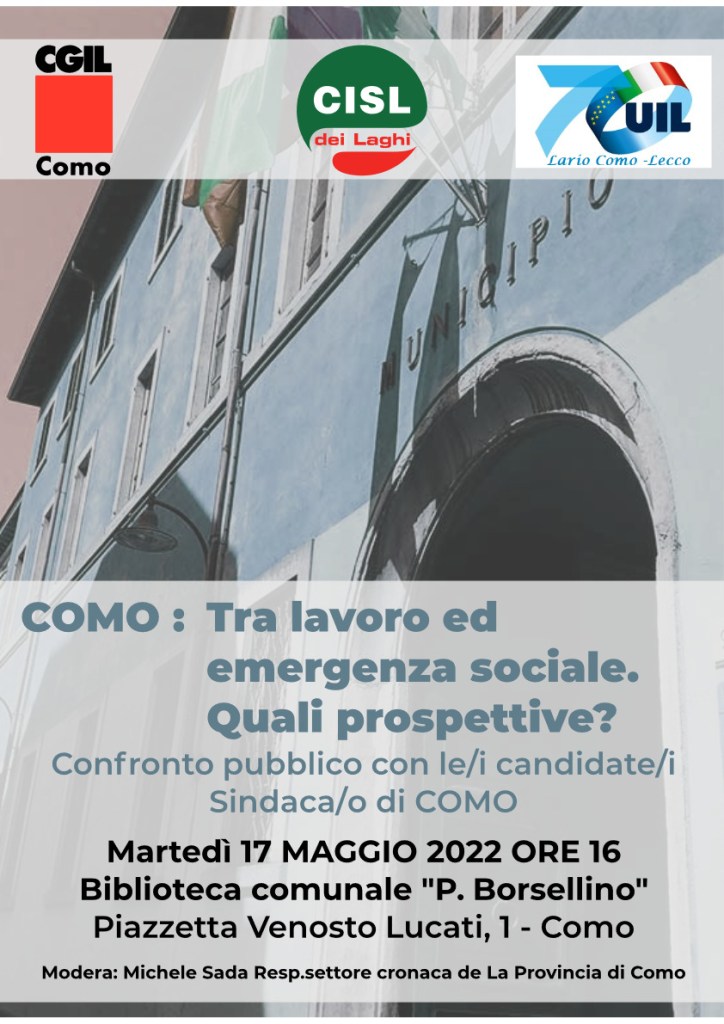 Cgil, Cisl e Uil hanno consegnato ai candidati Sindaci di Como un articolato documento unitario. Questi i temi sollevati: sviluppo della città; ruolo del capoluogo; mobilità; ambiente; servizi educativi – inclusione – ristorazione; cultura e sport; negoziazione sociale; pace. La conclusione è netta: “Riteniamo che la creazione di buona occupazione possa dare una risposta sostanziale al disagio sociale e alle disuguaglianze sempre più crescenti nel nostro territorio, e il capoluogo può essere promotore di azioni” .
