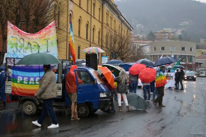 Anche quest’anno, come già l’anno scorso, dopo la pausa imposta dall’emergenza pandemica, la marcia è scivolata in avanti, ormai dentro quella primavera che si sperava potesse essere foriera di una rinascita non solo climatica ma anche ideale. Invece, il meteo – proprio in occasione della data scelta per la manifestazione – non è stato troppo clemente; tra le persone pronte a sfilare ci si consolava pensando che in tempi di siccità (subìta e – ancor peggio – attesa per i prossimi mesi) un po’ di pioggia non può essere criticata. Anzi – scherzando – si sottolineava che un primo obiettivo era stato raggiunto…