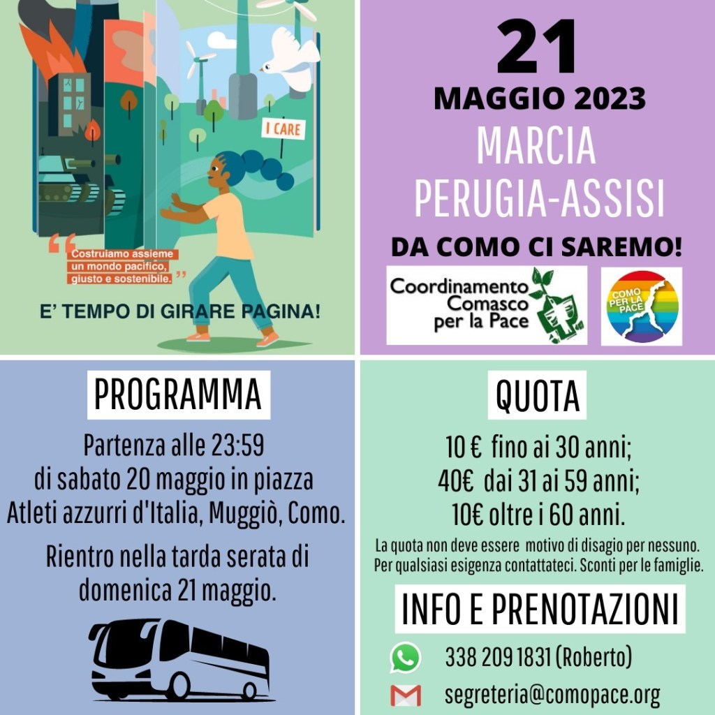 Domenica 21 maggio 2023 si terrà la Marcia della Pace e della fraternità Perugia-Assisi. Dal territorio di Como sarà possibile partecipare all’iniziativa con un pullman del Coordinamento comasco per la Pace. I dettagli logistici sono riportati nella locandina allegata. Per ragioni organizzative è necessario che chi intende iscriversi al pullman comunichi la propria presenza al più presto.