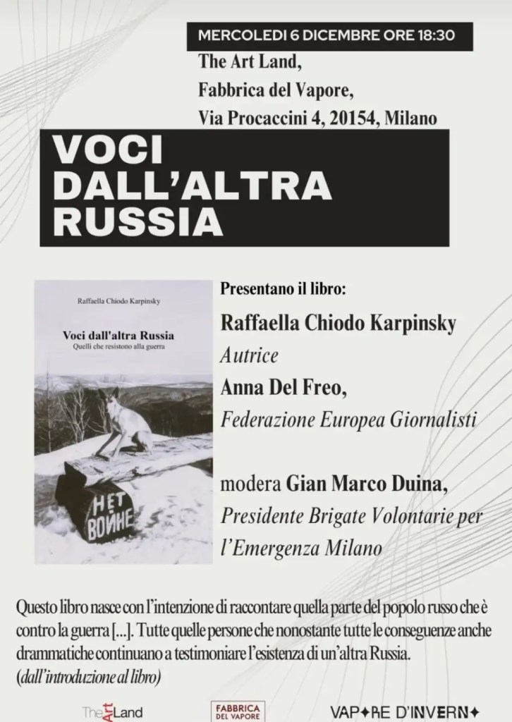 Il 6 dicembre alle ore 18:30 alla Fabbrica del Vapore in via Giulio Cesare Procaccini 4 a Milano, all’interno del centro culturale The Art Land, si terrà la presentazione del libro Voci dall’altra Russia insieme all’autrice Raffaella Chiodo Karpinsky, ad Anna Del Freo, della federazione europea dei giornalisti, e a Gian Marco Duina, Presidente Brigate Volontarie per l’emergenza Milano, nel ruolo di moderatore.