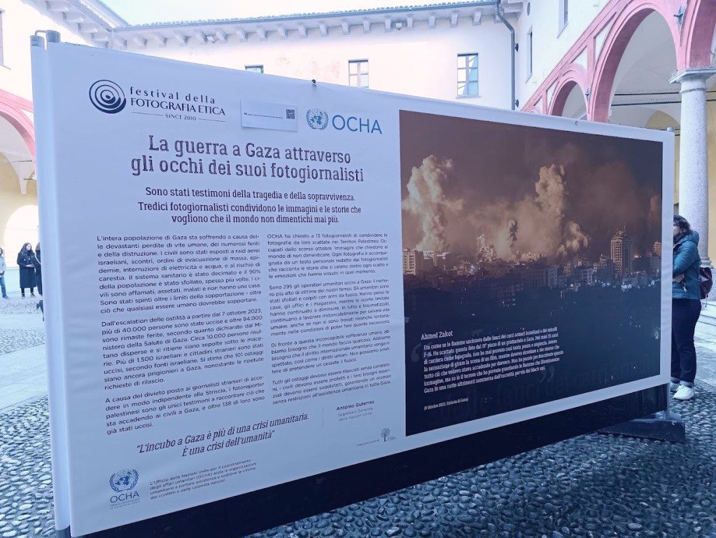 Al Festival della fotografia etica di Lodi che si è chiuso il 27 ottobre particolarmente intensa e drammatica, nella sezione Uno Sguardo sul Mondo, nel Palazzo della Provincia, la mostra The War in Gaza Through the Eyes of its Photojournalists, promossa dall’ufficio per il Coordinamento degli Affari Umanitari (OCHA). Dal 7 ottobre 2023, a Gaza più di 110.000 persone sono state uccise o ferite. In questo conflitto sono stati uccisi più bambini che in tutti i conflitti armati a livello globale degli ultimi quattro anni. Tre quarti della popolazione è sfollata. A causa del divieto posto ai giornalisti stranieri di entrare in modo indipendente nella Striscia, i fotoreporter palestinesi, oltre 100 dei quali sono già stati uccisi, sono la principale finestra su ciò che sta accadendo ai civili a Gaza e il loro contributo è fondamentale.