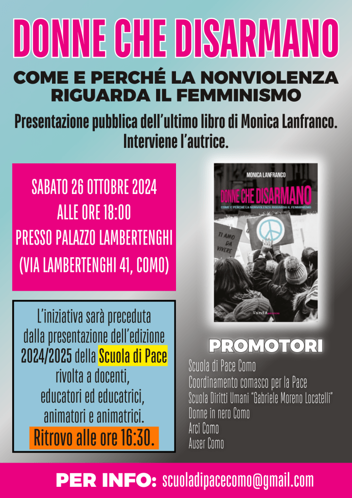 Il 26 ottobre a Palazzo Lambertenghi a Como, la presentazione con l’autrice, Mariateresa Lietti e Celeste Grossi del libro di Monica Lanfranco Donne che disarmano. Come e perché la nonviolenza riguarda il femminismo. Presto on line i video dell’inziativa con tutti gli interventi. In questo articolo sono già riportati i video di alcuni interventi da fb di ecoinformazioni. Nel seguito il reportage fotografico di Alle Bonicalzi.