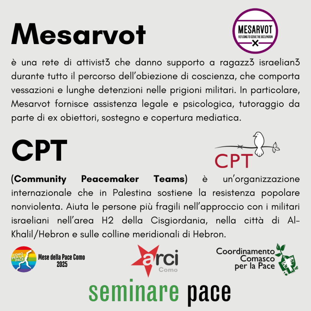Mesarvot è una rete di attivist3 israelianə che offre supporto legale, tutoraggio e visibilità mediatica a giovani che scelgono l’obiezione di coscienza, spesso affrontando lunghe detenzioni nelle prigioni militari.