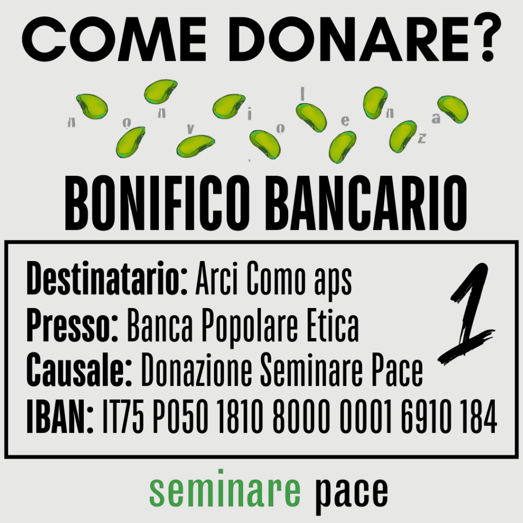 Arci Como APS Banca Etica IBAN: IT75 P050 1810 8000 0001 6910 184 Causale: Donazione Seminare pace.