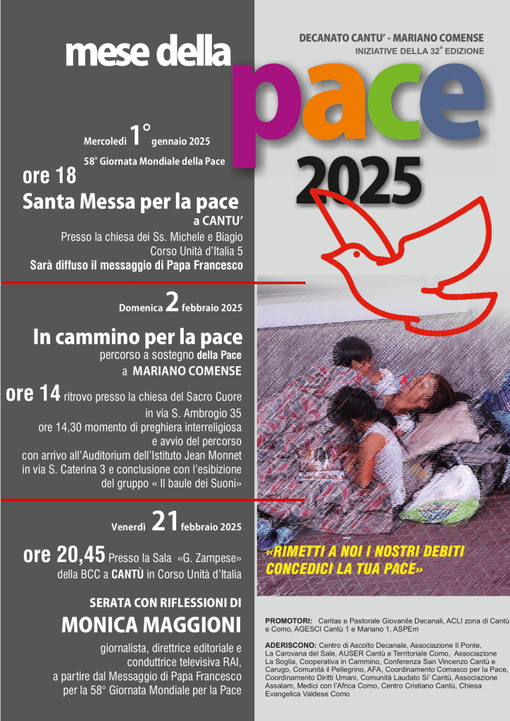 Mese della Pace, Pace Cantù e Mariano/ Mese della Pace Pubblicato da Matteo Ferrario il 28 dicembre 202423 gennaio 2025 Il programma del Mese della Pace 2025 a Cantù e Mariano Comense: Condividi: Condividi su X (Si apre in una nuova finestra) X Condividi su Facebook (Si apre in una nuova finestra) Facebook Mi piace Caricamento... Correlati