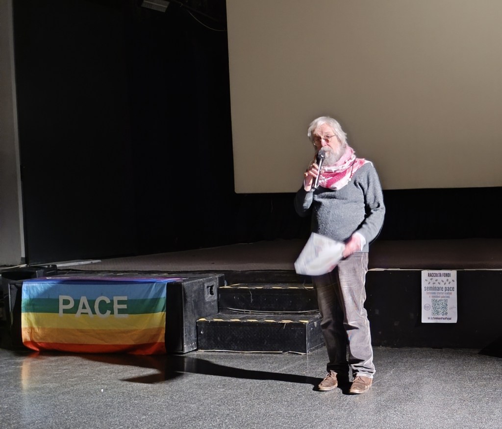 Come già anticipato da Fabio, abbiamo deciso di promuovere questa serata come Arci Comitato di Como, insieme al Coordinamento Comasco per la Pace e alle iniziative che, sul territorio, durante il mese della Pace, sono numerose in sostegno alla causa palestinese. In particolare, avrete visto, se qualcuno di voi era alla marcia della pace del 12 gennaio a Como o in altre occasioni in cui ne abbiamo parlato, che stiamo sostenendo questa campagna a sostegno di organizzazioni israeliane e palestinesi che promuovono la non violenza. Si chiama “Seminare Pace” e trovate all’ingresso anche informazioni più dettagliate. Se vi interessa, siamo qui tutta la sera.