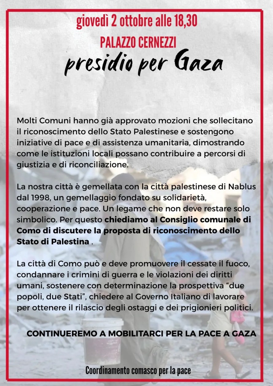 La Como della Pace, fedele al titolo di cui la citta è insignita di Messagera di Pace ritenta – dopo lo sbeffeggiamento ricevuto il 17 febbraio dal sindaco Rapinese di una mozione presentata dal Pd appoggiato da Svolta Civica, Forza Italia e Fratelli d’Italia – con il Coordinamento comasco per la Pace e innumerevoli adesioni la strada della proposta accorata e certamente condivisa dalla maggioranza degli abitanti di Como. Presidio a Palazzo Cernezzi giovedì 2 ottobre alle 18,30.