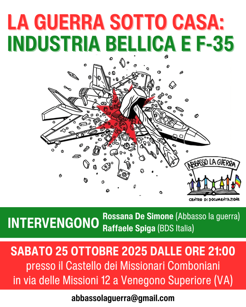 A seguito della settimana internazionale di azione contro i caccia F-35, sabato 25 ottobre 2025 dalle ore 21:00 presso il Castello dei Missionari Comboniani in via delle Missioni 12 a Venegono Superiore (VA) si terrà, come da locandina in allegato, la serata di approfondimento La guerra sotto casa: industria bellica e F-35.